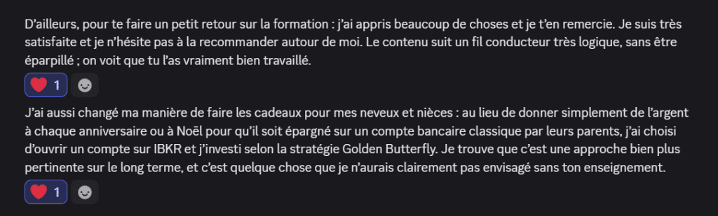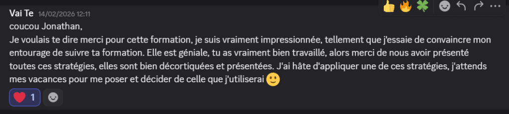 L’accès à la plateforme de la formation et aux cours vidéo est illimité. Par contre, mon accompagnement via le groupe Discord est limité pour une durée de 6 mois à partir de ton inscription à la formation.